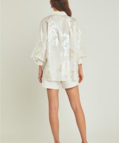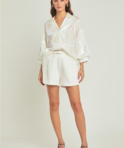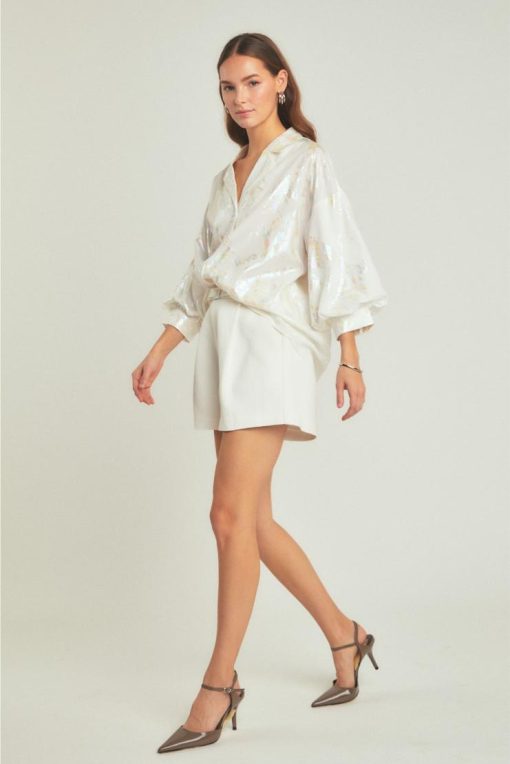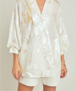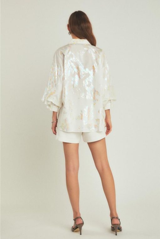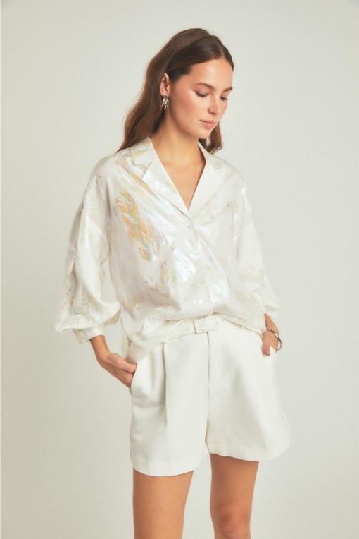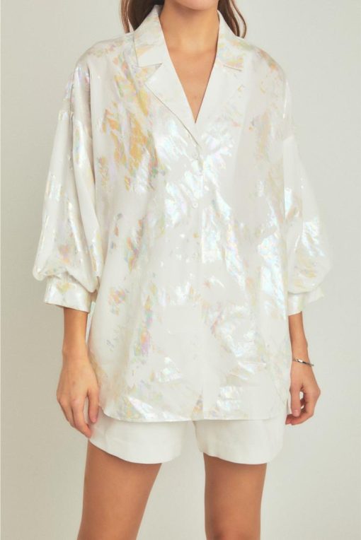 A shimmering foil print elevates this blousy button-front shirt framed by dropped shoulders.
