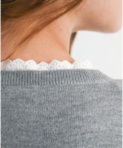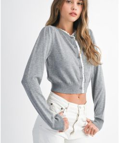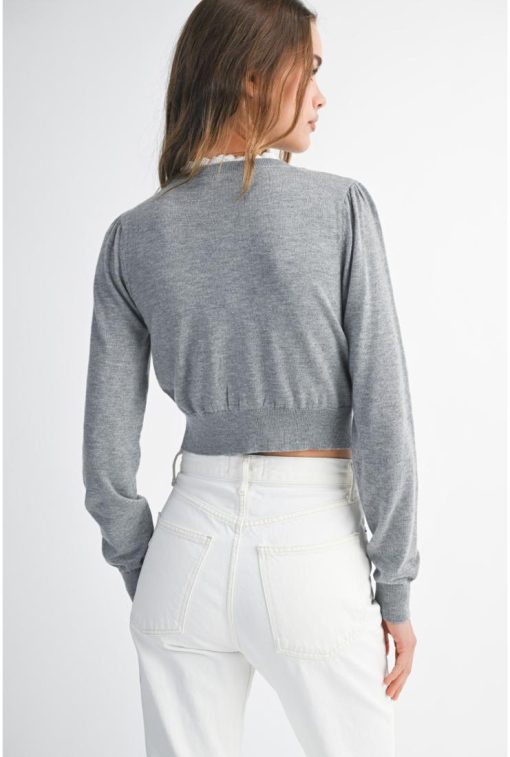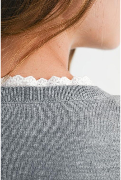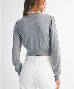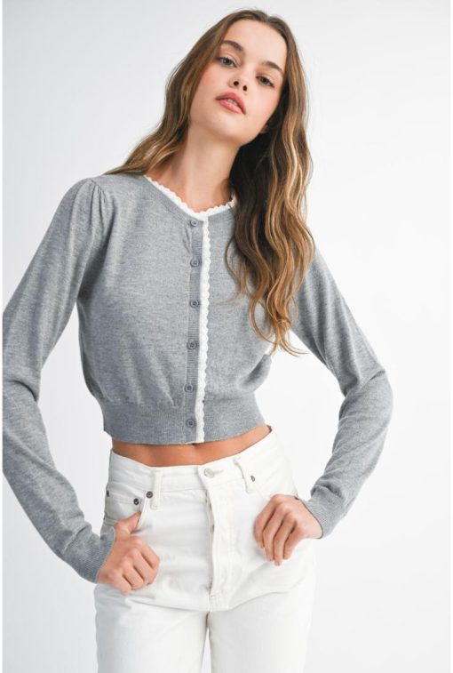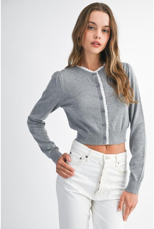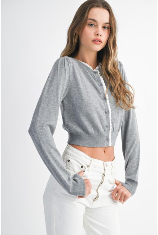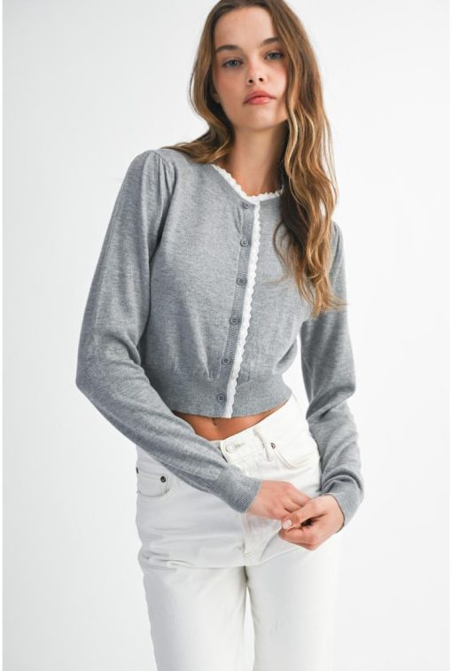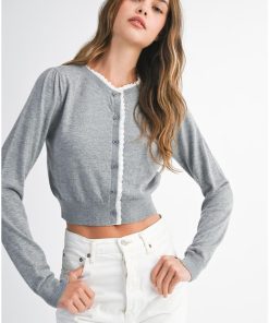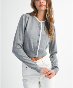 Cozy meets cute in this Avery Knit Button Up Cardigan! The soft gray knit is perfectly paired with delicate lace contrast trim, adding a flirty touch to your everyday look. Button it up for warmth and style that’s as charming as it is comfy—your new go-to for layering with a playful twist.