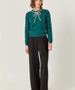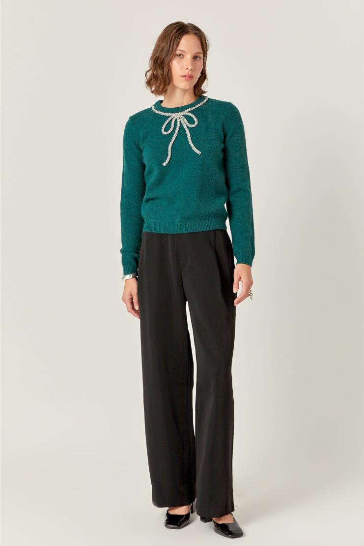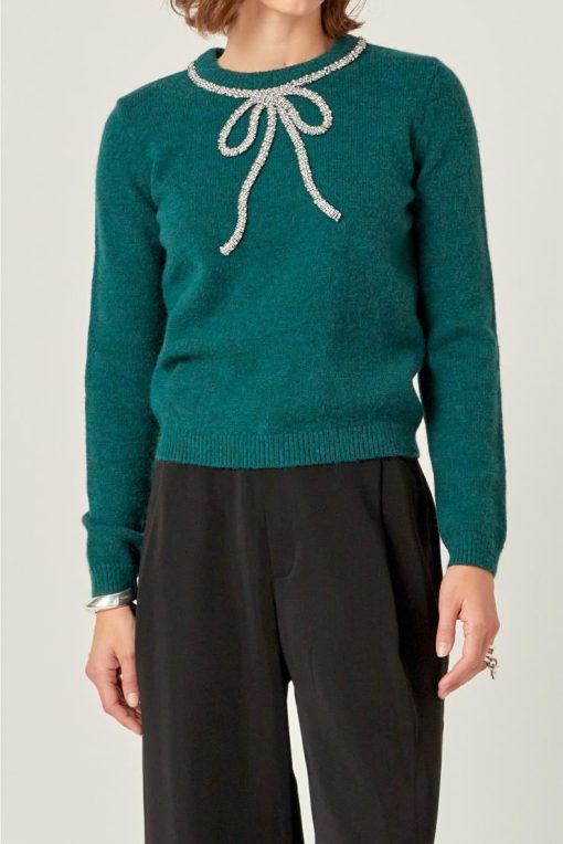 Add some sparkle to your winter wardrobe with our Rhinestone Bow Knit Sweater in green. This playful piece features a rhinestone bow detail, making it the perfect mix of cute and cozy. Stay warm and stylish in our unique and quirky sweater.