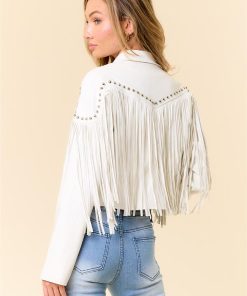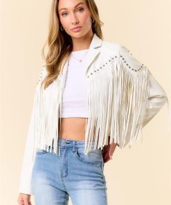 Unleash your inner rockstar in the Callie Fringe Faux Leather Stud Detail Jacket. With fringe details and edgy stud accents, this jacket is perfect for making a statement. Amp up any outfit with this versatile piece.