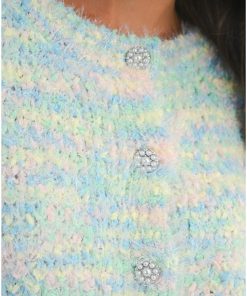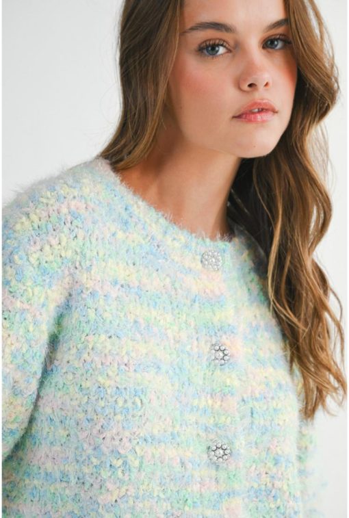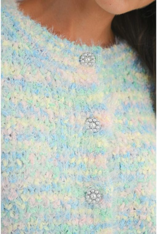 Wrap yourself in sweet charm with this mint-colored knit cardigan, accented by delightful pearl buttons that add a touch of whimsy. Soft and cozy, it’s perfect for layering on cooler days while keeping your style fresh and fun. Whether you’re dressing up or down, this cardigan brings a playful pop of pastel to any outfit.