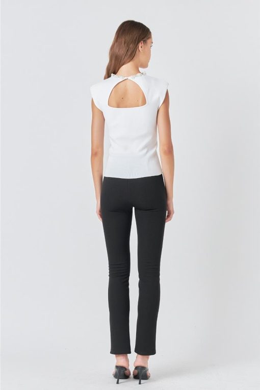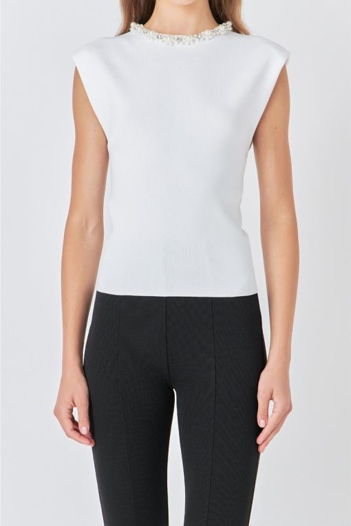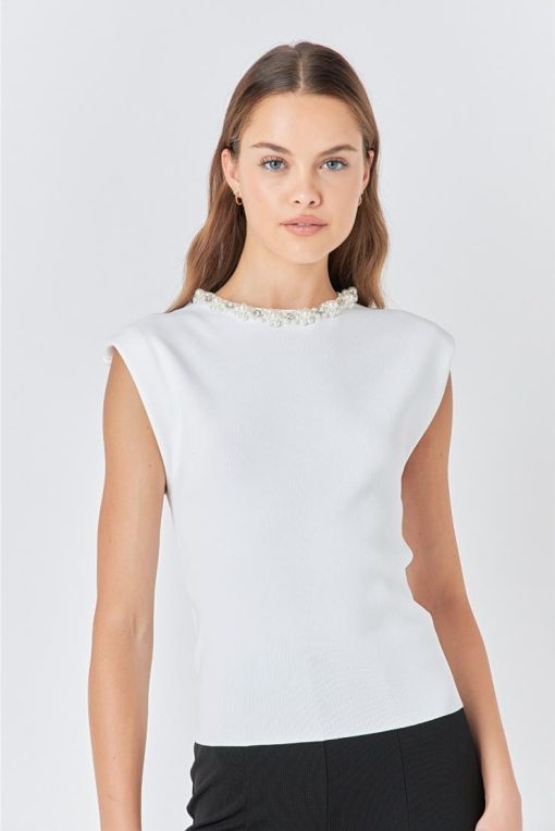 Elevate your wardrobe with our Kelly Knit Top, featuring an embellished pearl neck line. Made from quality knit material, this top exudes elegance and sophistication. Perfect for any occasion, the pearl detailing adds a touch of glamour to your look while the knit fabric provides comfort and durability. Upgrade your style with our Kelly Knit Top today.