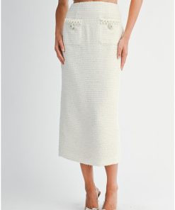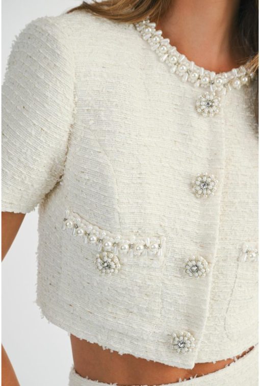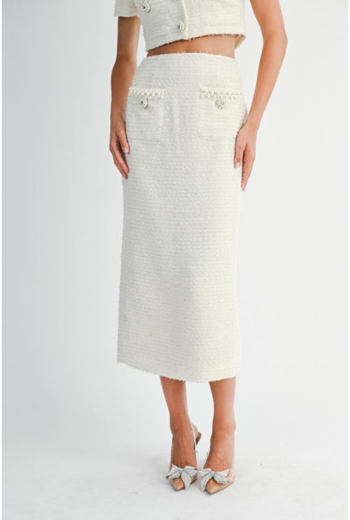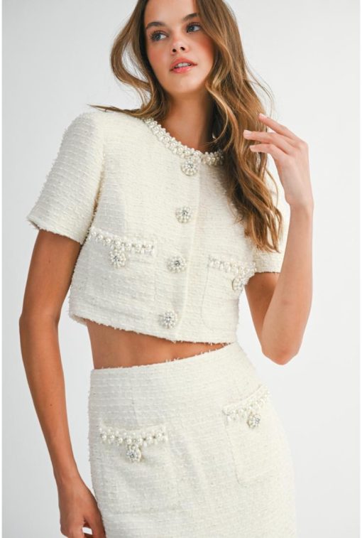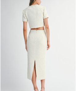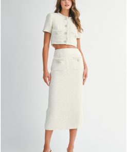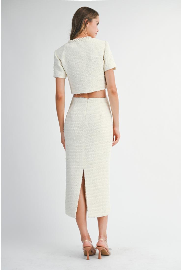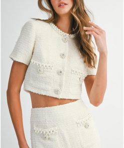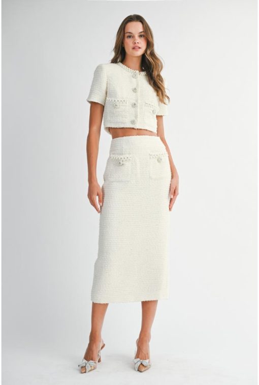 Step out in style with the Mackenzie Tweed Jeweled Button Up Crop Jacket and Midi Skirt, each sold separately to mix, match, and make every outfit uniquely yours. Featuring sparkling jeweled buttons and a classic tweed texture, the crop jacket adds a flirty edge while the midi skirt offers elegant sophistication. Perfect for playful layering or striking solo, these pieces turn any occasion into a chic adventure.