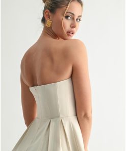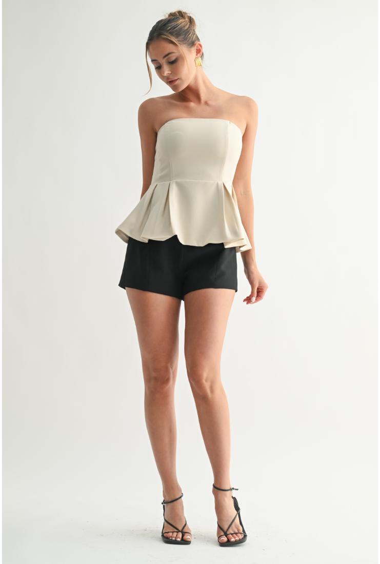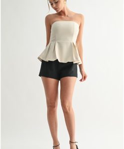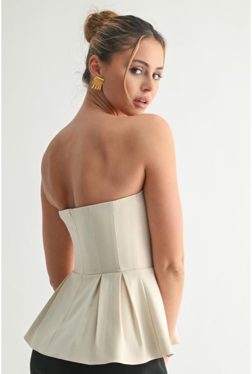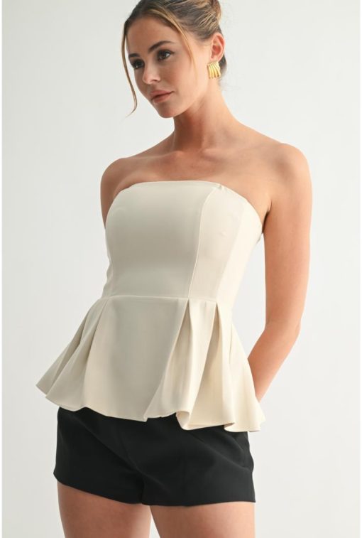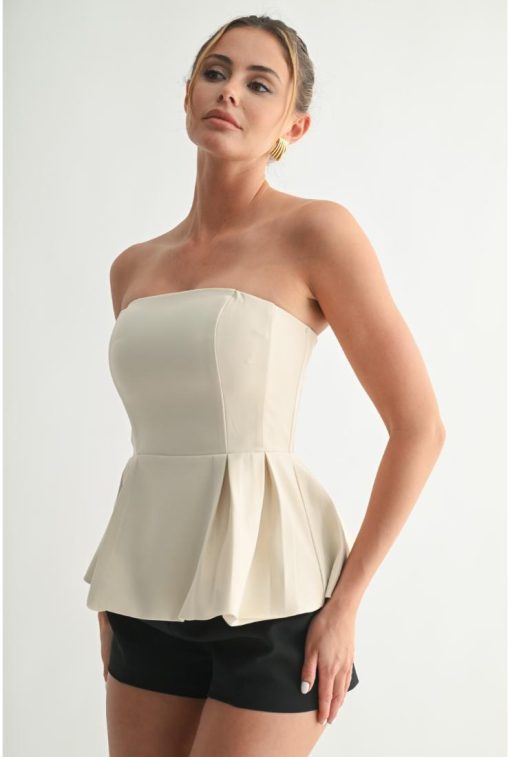 Elevate your wardrobe with the Olivia Sculpted Peplum Strapless Top in Ivory. Designed with a refined silhouette, its structured peplum detail accentuates the waist, while the strapless neckline offers a timeless, elegant appeal. Crafted for a flawless fit, this top effortlessly blends sophistication with modern style, making it perfect for both formal occasions and chic everyday wear.