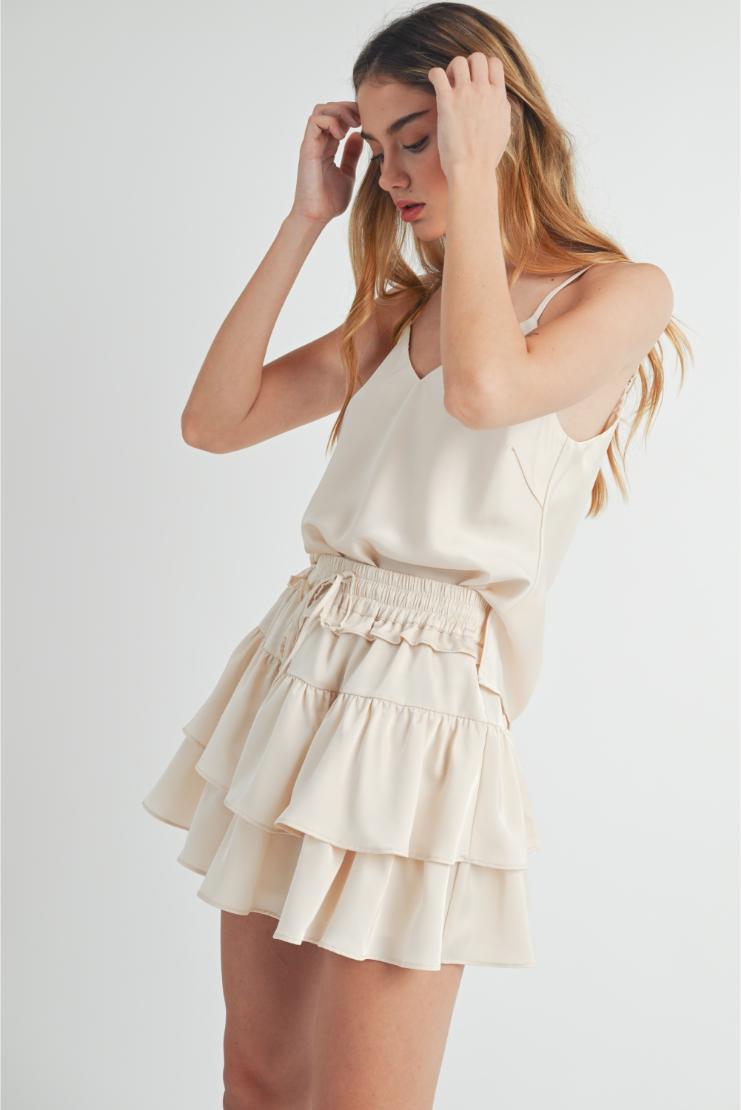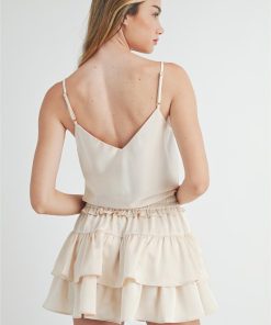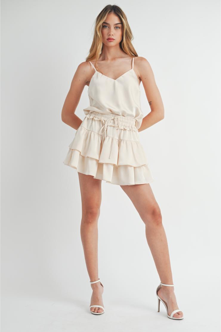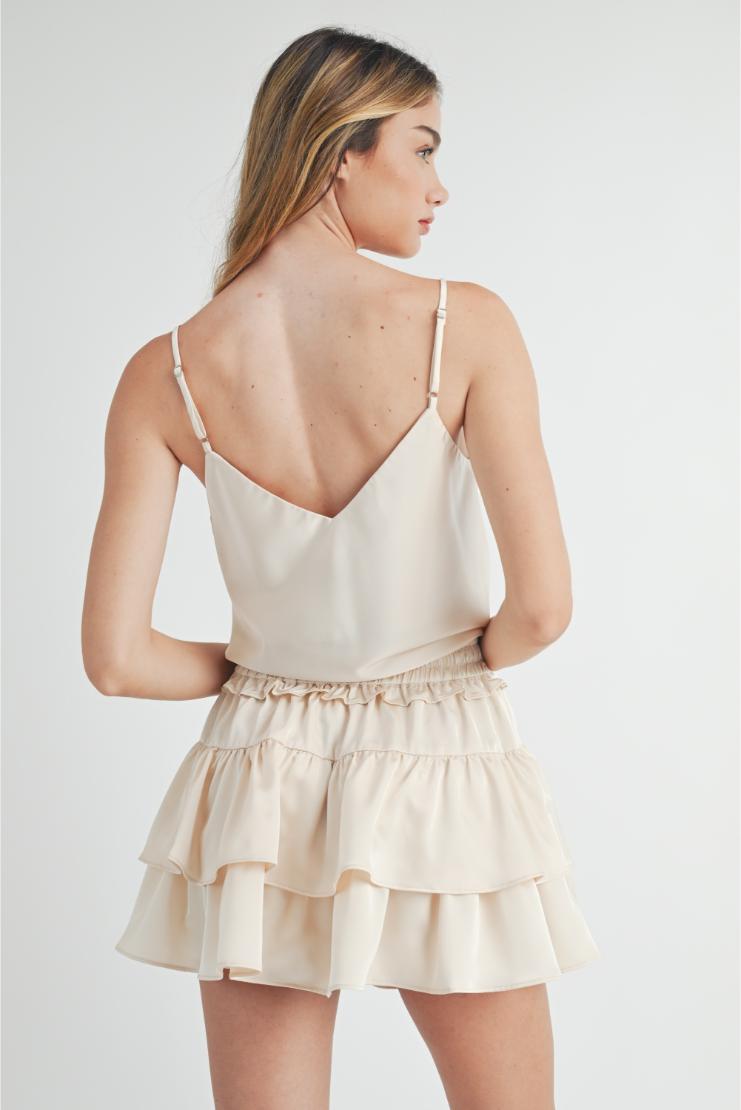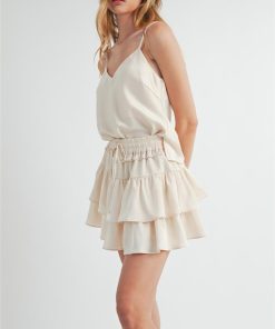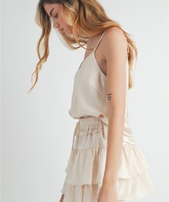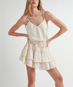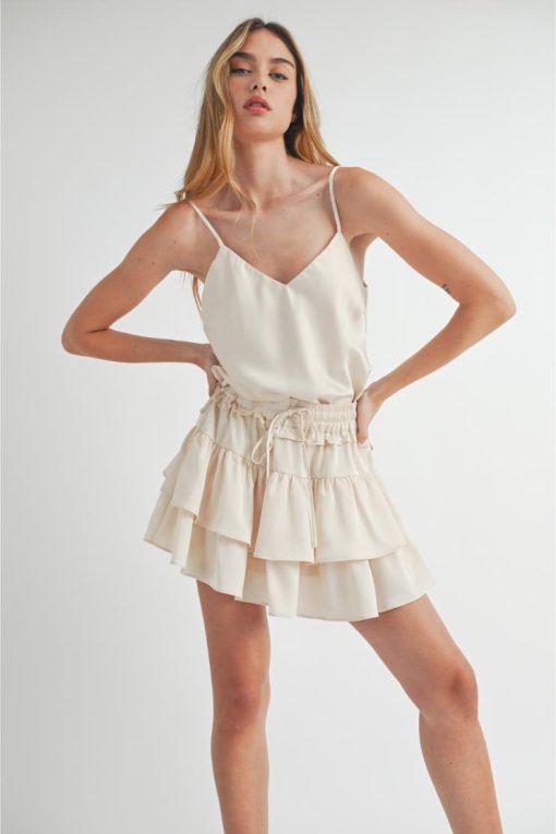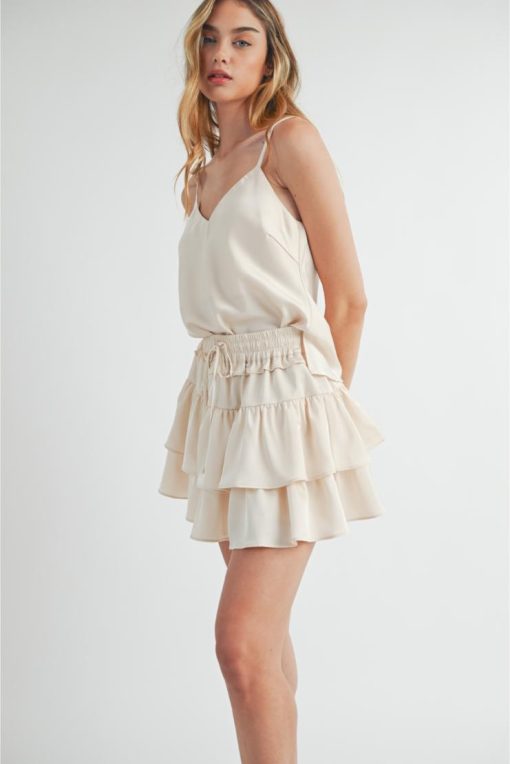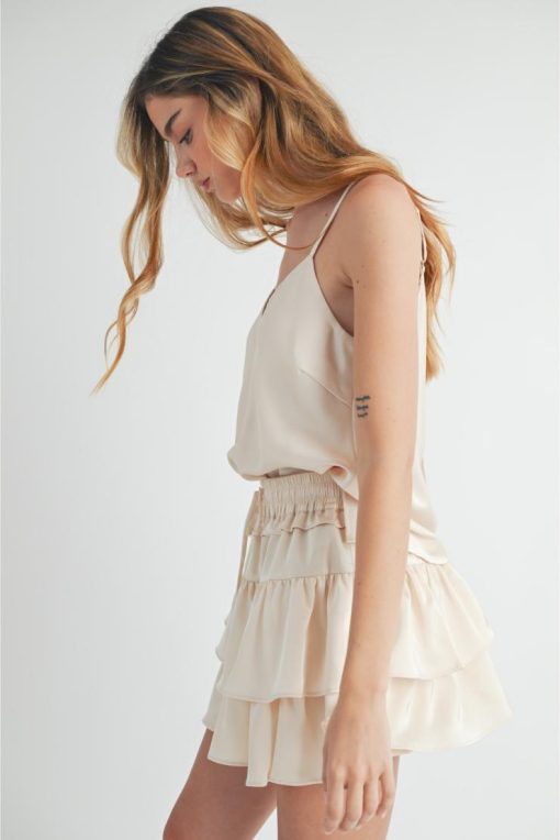 Mix and match in this versatile Satin Cami and Ruffle Tiered Mini Skirt Set. Perfect for a flirty night out or a trendy daytime look. Sold separately.