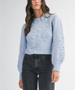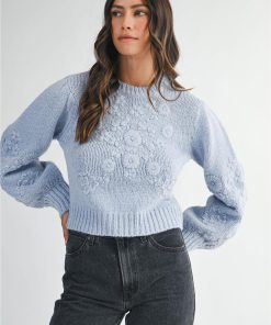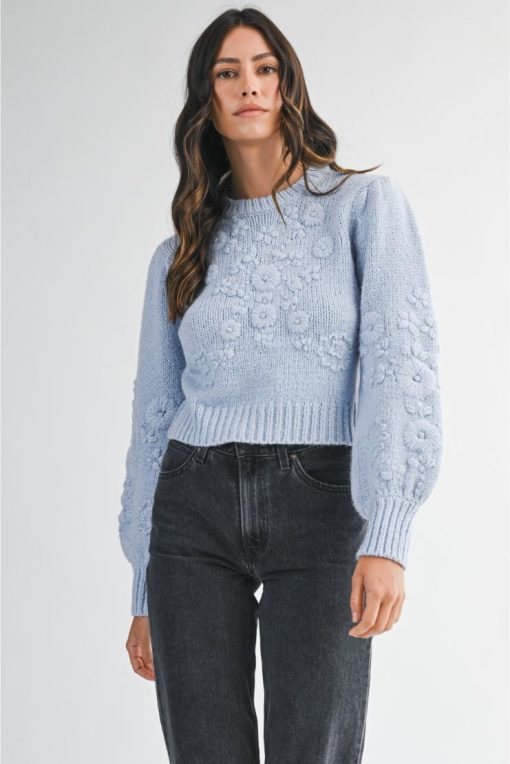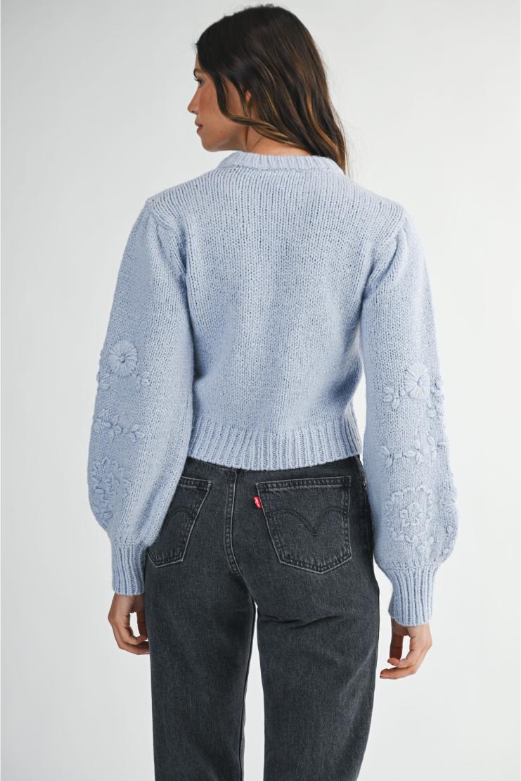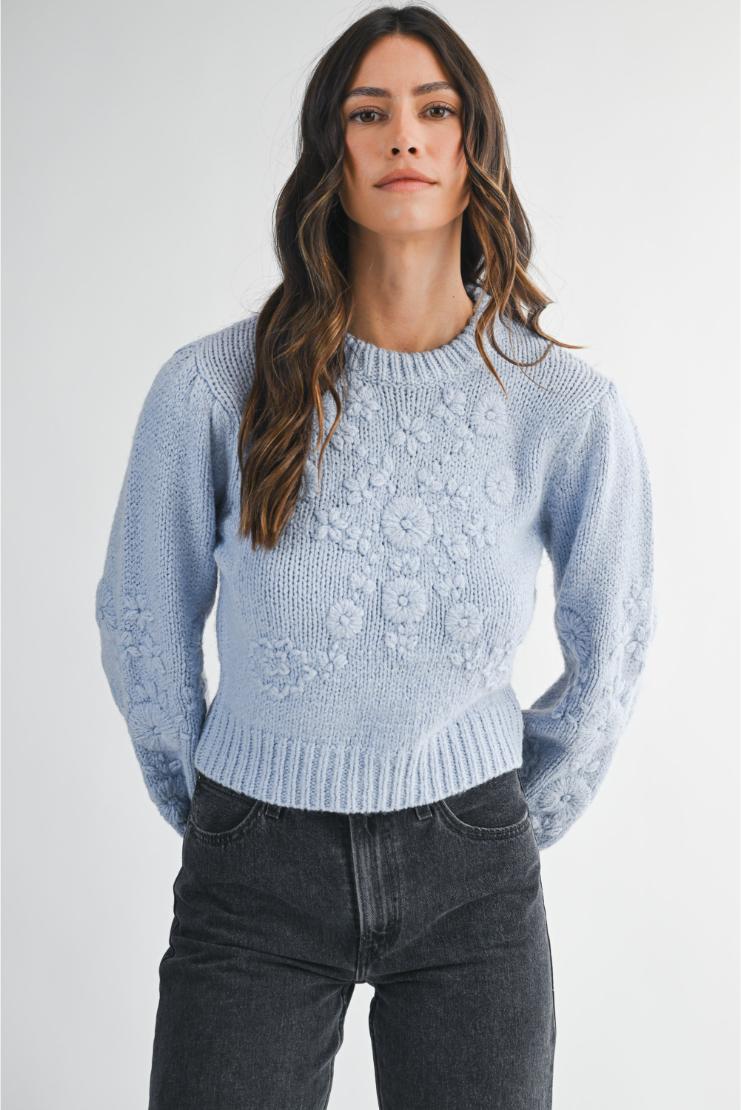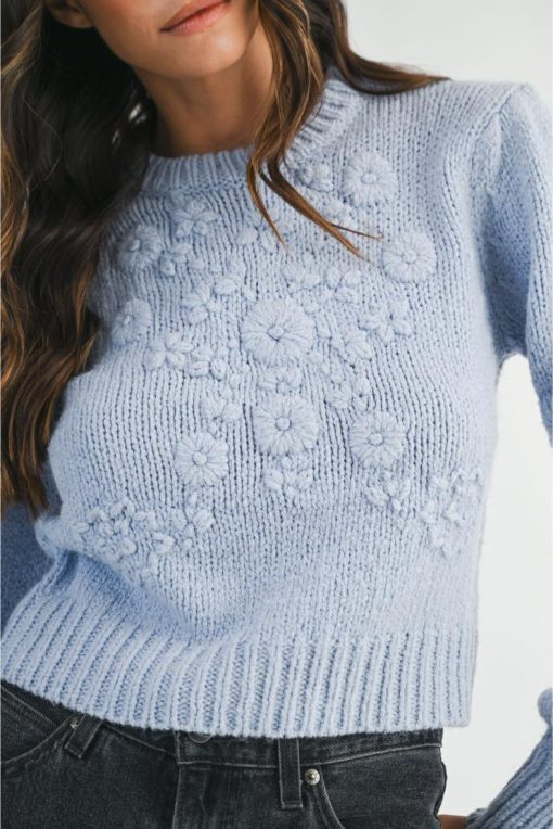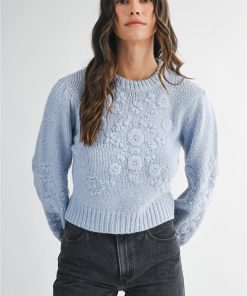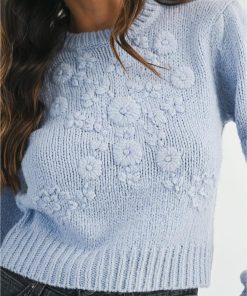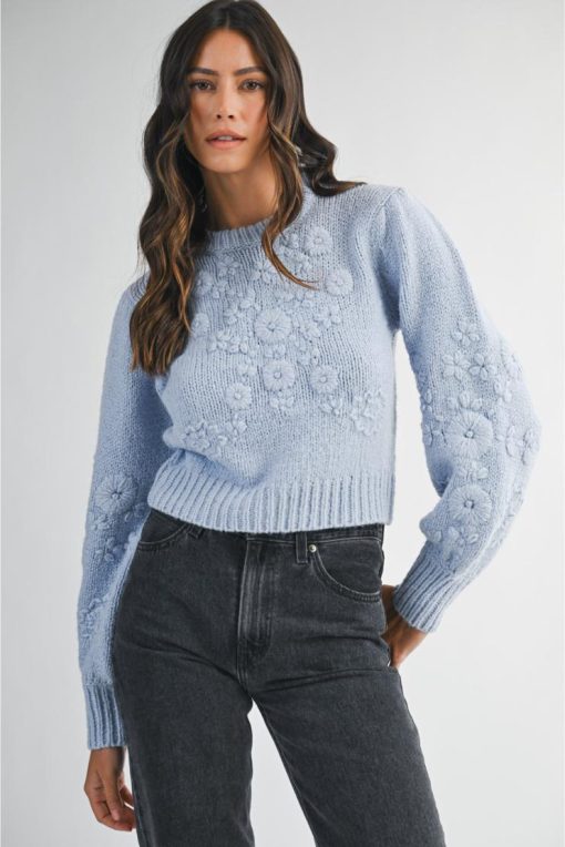 Wrap yourself in charm with the Tia Floral Embroidered Long Sleeve Sweater in light blue. Its delicate floral embroidery adds a whimsical touch, while the cozy fabric keeps you comfortably stylish all day. Perfect for brightening up any outfit, this playful sweater pairs effortlessly with your favorite jeans or skirts for a fresh, fun look.
