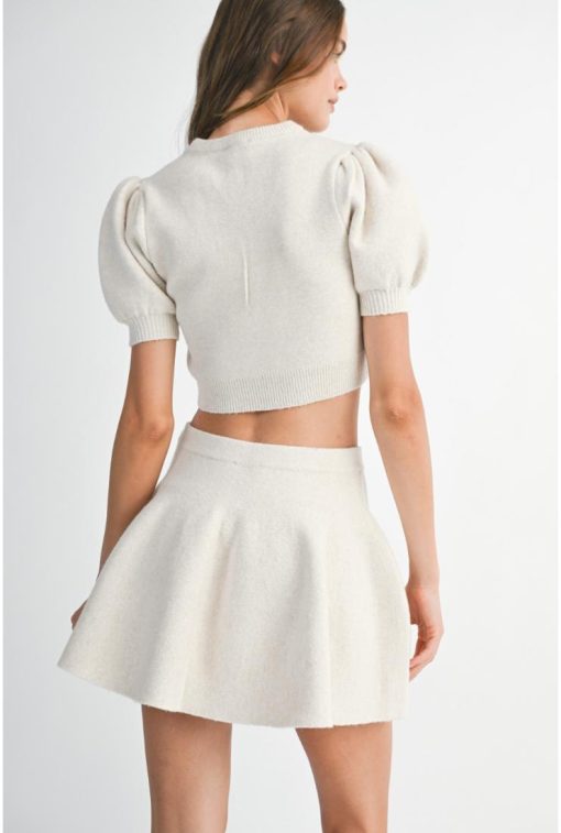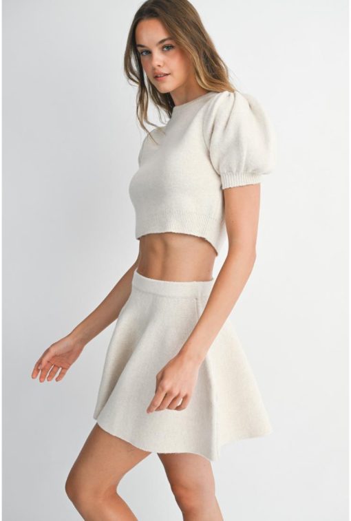 Elevate your style with the Zoie Puff Sleeve Knit Crop Top and Mini Skirt, each sold separately for mix-and-match fun. The crop top features charming puff sleeves that add a flirty touch, while the knit fabric ensures cozy comfort. Pair it with the matching mini skirt for a playful, coordinated look perfect for sunny days or casual outings. Whether worn together or styled individually, these pieces bring a fresh, youthful vibe to your wardrobe.