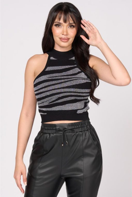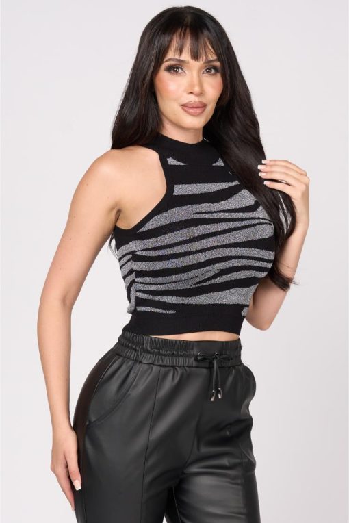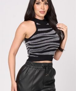 Pippa & Pearl Women’s Apparel Zoya Zebra Print Metallic Knit Crop Top – Silver | Silver