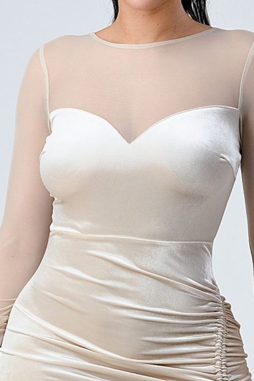 Double takes become second nature when you step out in this sheer long sleeve-velvet mini with side ruching that gathers the knit fabric and all of the attention.