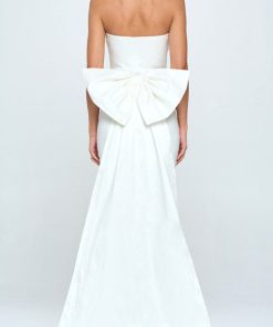 An oversized detachable back bow creates visual elegance on a chic minidress framed by ruching and shoulder baring top.