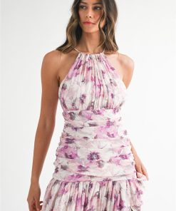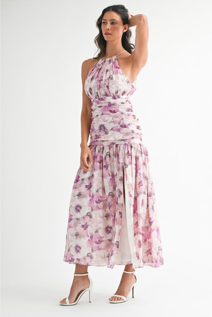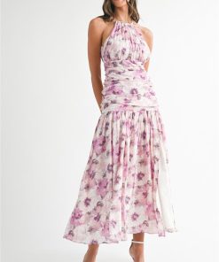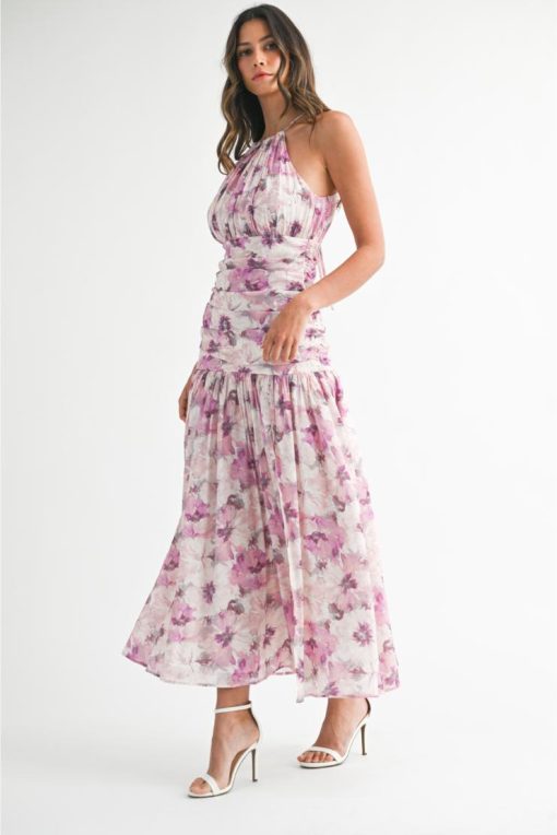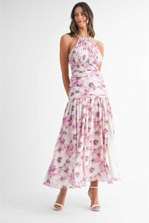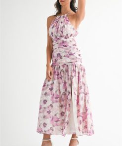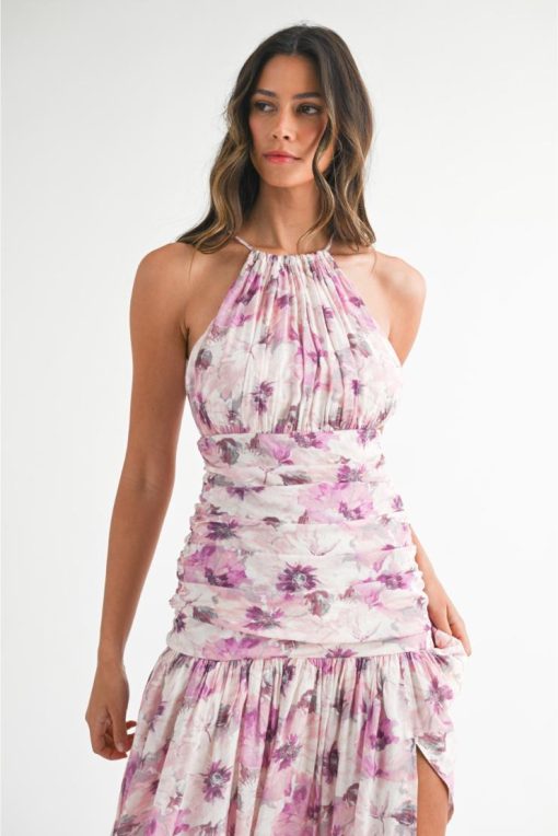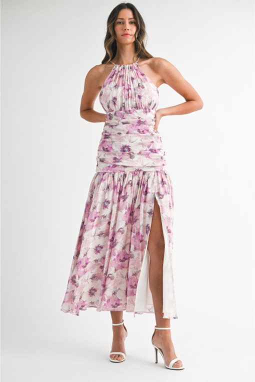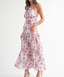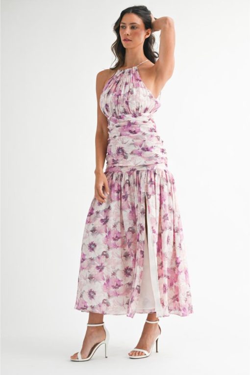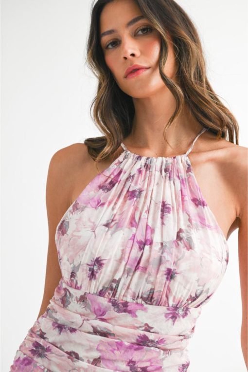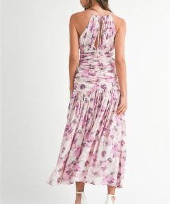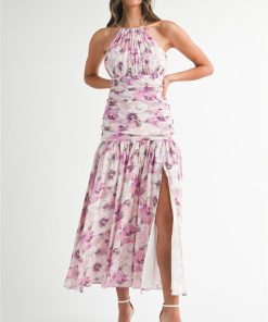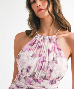 Pippa & Pearl Women’s Dresses Summer Floral Print Ruched Halter Midi Dress – Pink | Pink