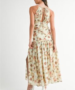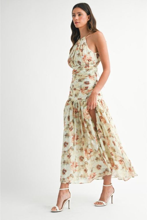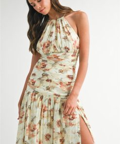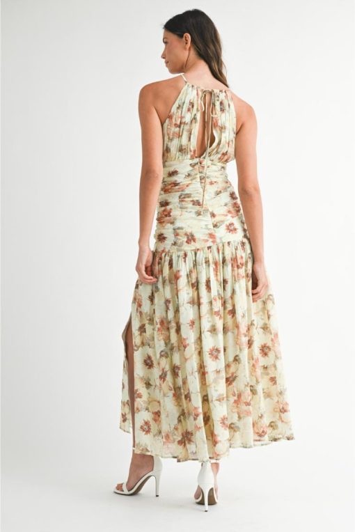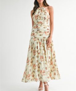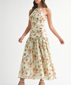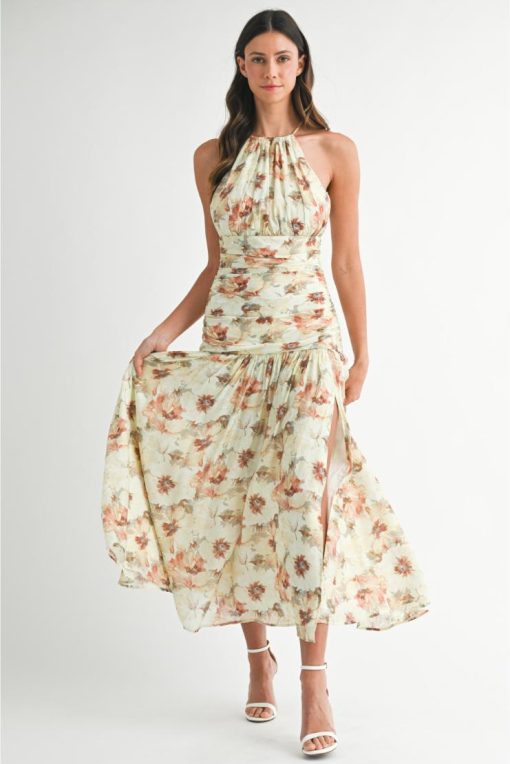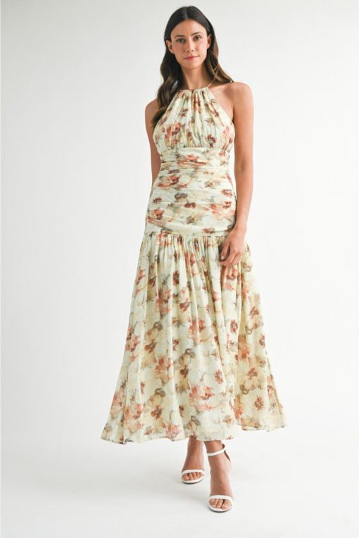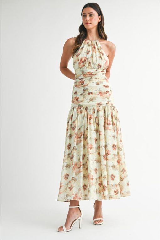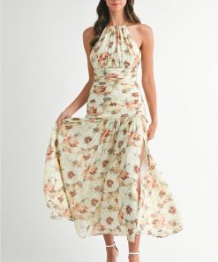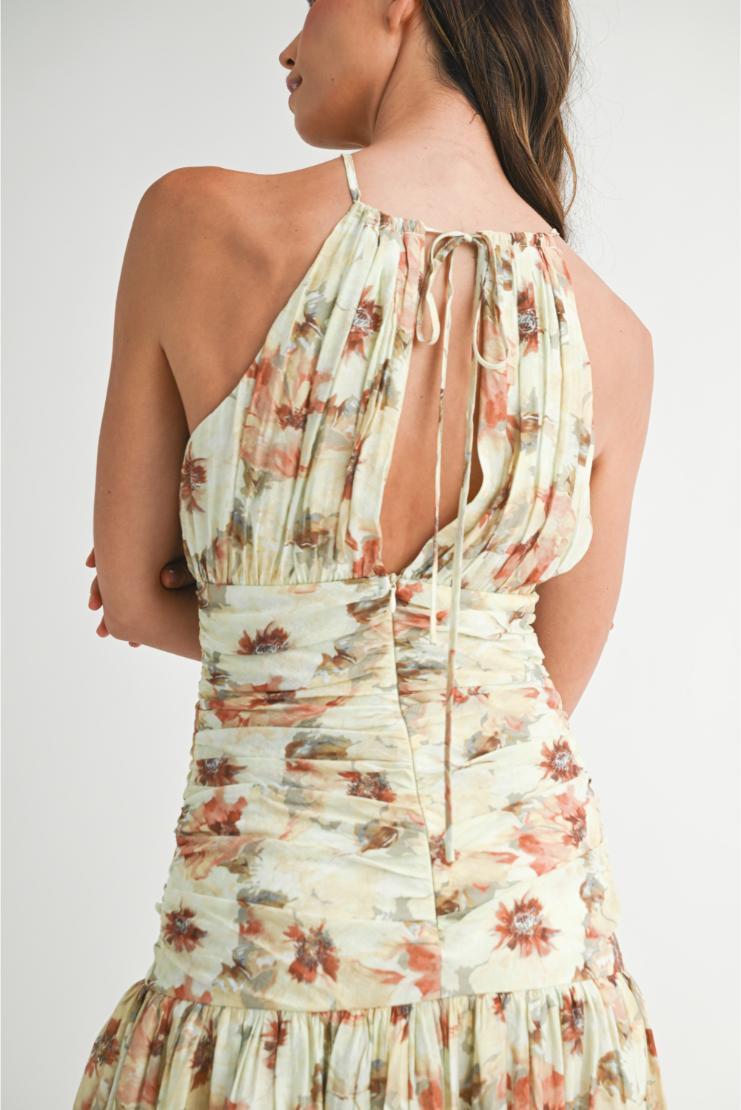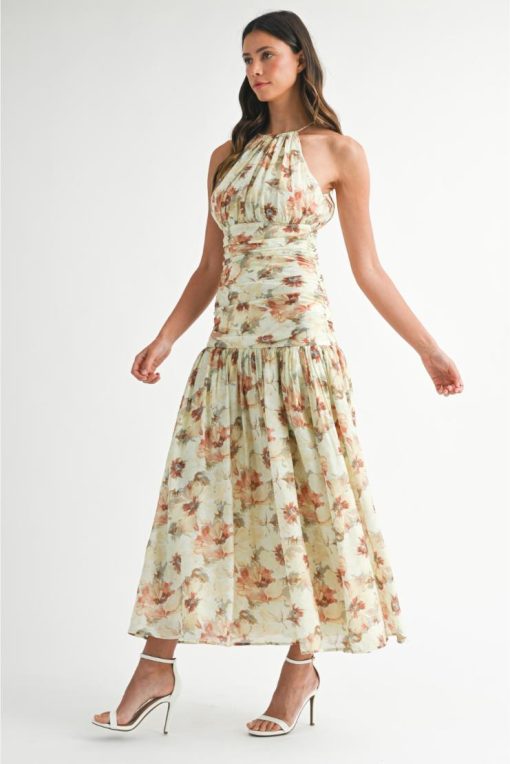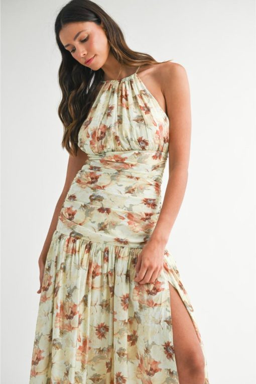 Indulge in the opulence of summer with our Summer Floral Print Ruched Halter Midi Dress in vibrant yellow. The intricate floral print and ruched detailing exude sophistication and elegance, while the halter neckline adds a touch of sensuality. Step into the season of style with this exclusive dress.