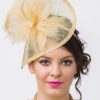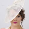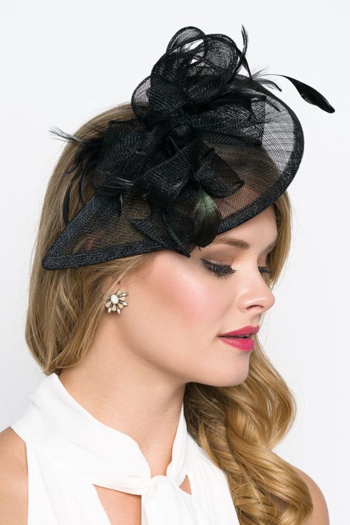 Timeless glamour. This sassy fascinator gives a nod to vintage style with a bouncy mesh ribbon and flighty feathers. With its classic sinamay mesh shape and elegant look it will be your go-to fascinator for the season.