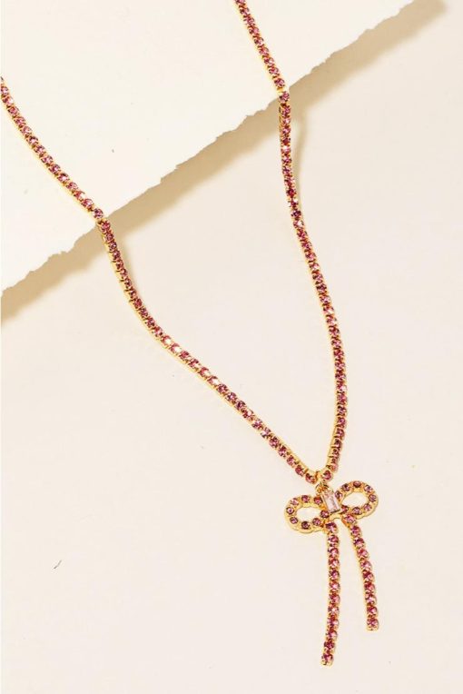 Pippa & Pearl Women’s Pink Rhinestone Gold Chain And Ribbon Bow Pendant Necklace | Pink