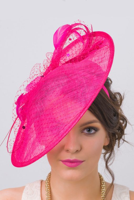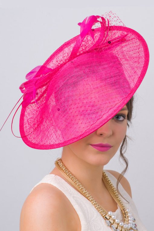 Vintage inspiration, modern attitude. Equipped with netting, feathers and circular mesh ribbons, this is the fascinator every style setter needs for that special party. Gorgeous in an up-do or with your hair down. A classic wide brimmed fascinator is a cornerstone of any style setter’s hat collection. This fascinator makes a sharply sophisticated statement and a seamless day-to-night transition.
